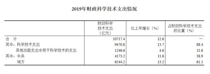 2019年,國家財(cái)政科學(xué)技術(shù)支出10717.4億元,比上年增加1199.2億元,增長12.6%。其中,中央財(cái)政科學(xué)技術(shù)支出4173.2億元,增長11.6%,占財(cái)政科學(xué)技術(shù)支出的比重為38.9%;地方財(cái)政科學(xué)技術(shù)支出6544.2億元,增長13.2%,占比為61.1%。