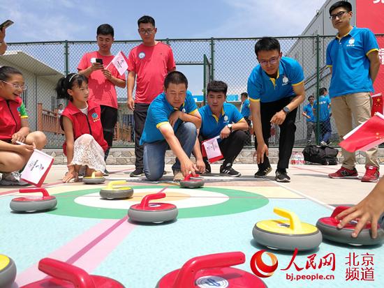 “海坨之星”地壺球隊(duì)的小隊(duì)員們,和冬奧工程一線建設(shè)者們一起打了一場(chǎng)充滿歡聲笑語的友誼地壺球賽。人民網(wǎng)尹星云 攝