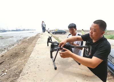 工作人員正在使用無人機(jī)對(duì)排污口進(jìn)行排查記者 何沛霖 攝