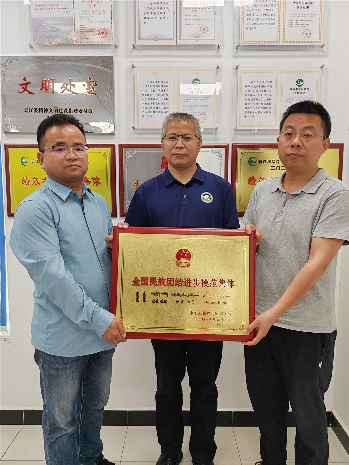 2019年9月27日,全國(guó)民族團(tuán)結(jié)進(jìn)步表彰大會(huì)在北京舉行,長(zhǎng)科院農(nóng)水所榮獲“全國(guó)民族團(tuán)結(jié)進(jìn)步模范集體”稱(chēng)號(hào)。長(zhǎng)科院農(nóng)水所以過(guò)硬的政治素質(zhì)和在促進(jìn)民族團(tuán)結(jié)、維護(hù)民族穩(wěn)定、推進(jìn)少數(shù)民族地區(qū)經(jīng)濟(jì)發(fā)展所做出的突出成績(jī),成為當(dāng)年全國(guó)水利系統(tǒng)中的唯一一個(gè)獲此殊榮的集體。