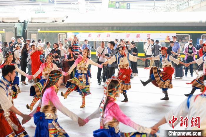 發(fā)車(chē)儀式上,大型藏族舞蹈表演歡迎游客乘車(chē)。記者 賈天勇 攝