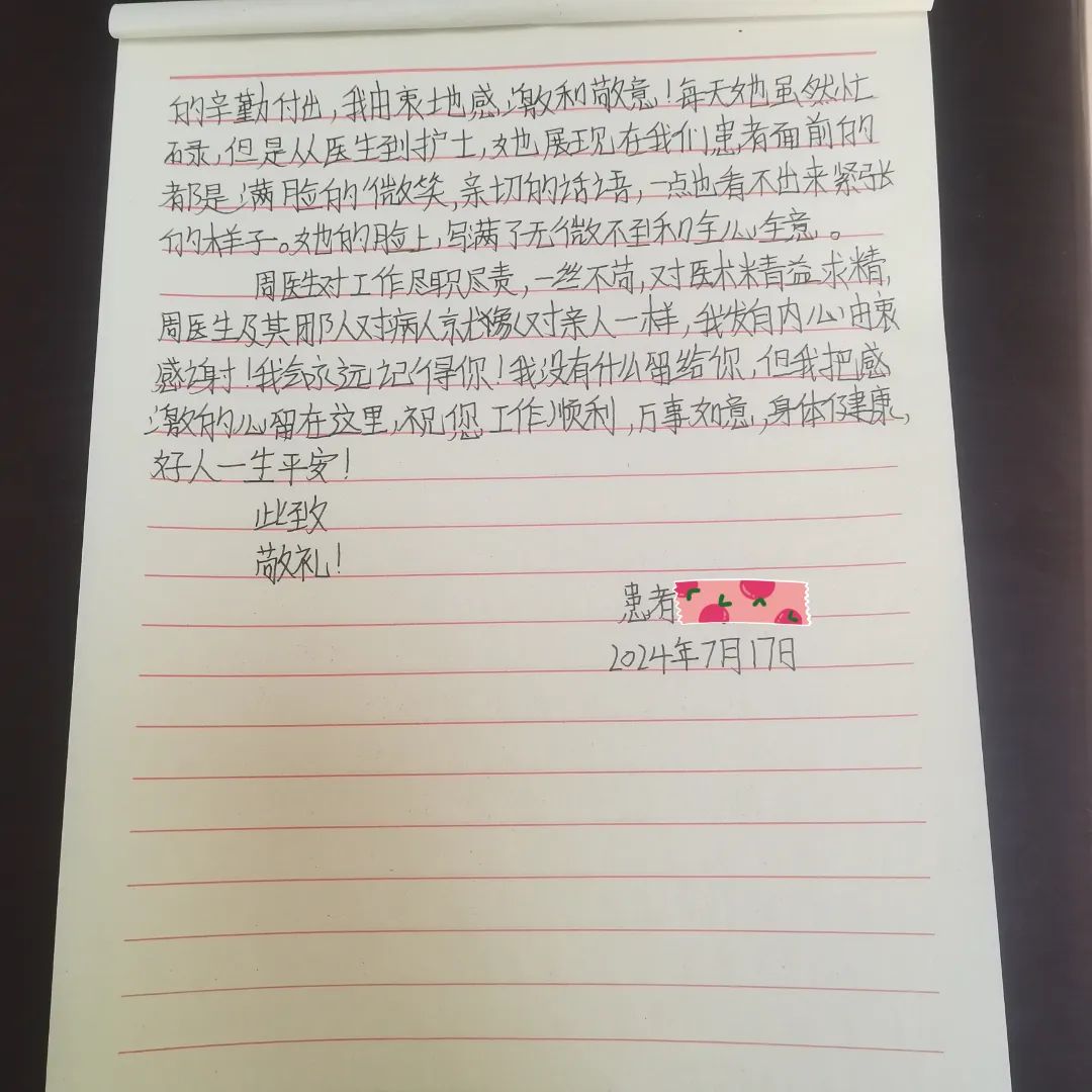 7月1日,一名在德格縣人民醫(yī)院就診的結核患者向成都市公共衛(wèi)生臨床醫(yī)療中心援藏醫(yī)師周瑜送來了一封感謝信,在信中,患者對周瑜醫(yī)生及其團隊在住院期間給予她的積極診治和熱情關懷表示感謝,并對科室團隊的診療技術和治療的預后效果都作出了非常高的評價。