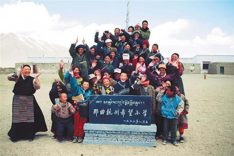 那曲杭州希望小學建成時,老師和學生在石碑前合影留念。色尼區(qū)委宣傳部提供