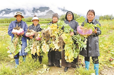 中國科學院創(chuàng)新研發(fā)的蕪菁種植技術為促進當?shù)剞r(nóng)業(yè)生產(chǎn)與畜牧業(yè)的發(fā)展提供了技術支撐。圖為拉薩市曲水縣才納鄉(xiāng)村民抱著蕪菁新品種。