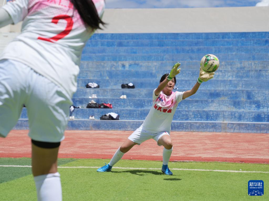 在西藏日喀則市上海實驗學(xué)校,“珠峰雪鷹”女子足球隊守門員邊普在操場上訓(xùn)練(9月3日攝)。