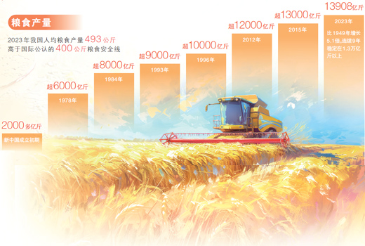 豐收成色十足。“藏糧于地、藏糧于技”戰(zhàn)略深入實(shí)施,我國(guó)糧食綜合生產(chǎn)能力穩(wěn)步提升,連續(xù)9年穩(wěn)定在1.3萬億斤以上。截至2023年,全國(guó)綠色、有機(jī)、名特優(yōu)新和地理標(biāo)志農(nóng)產(chǎn)品認(rèn)證登記總數(shù)達(dá)到7.5萬個(gè)。蔬菜水果品種琳瑯滿目,居民的“菜籃子”“果盤子”更加豐富。