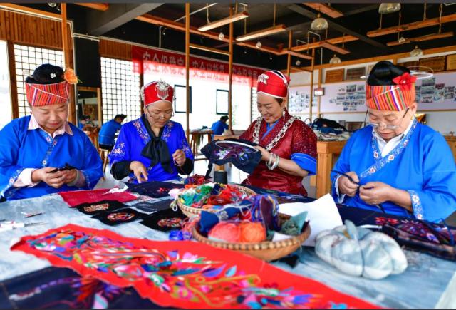 貴州省級(jí)非遺苗繡代表性傳承人龍祿穎創(chuàng)辦了非遺文化企業(yè),帶領(lǐng)各族群眾就業(yè)增收。圖為龍祿穎(右二)和公司員工們在手工刺繡車間刺繡。新華社記者 楊文斌 攝