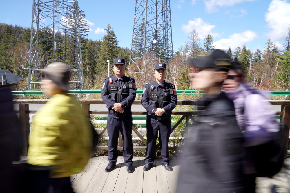 吉林長白山邊境管理支隊民警在景區(qū)游客密集處執(zhí)勤。