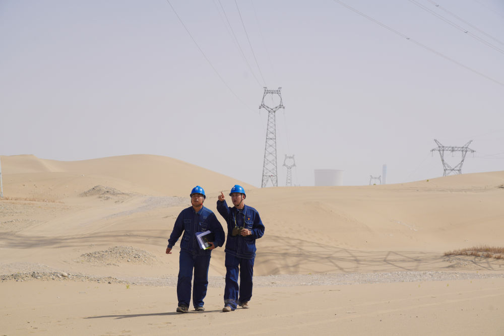 夏布哈提·馬合思提江(右一)和同事一起進行線路巡視工作。