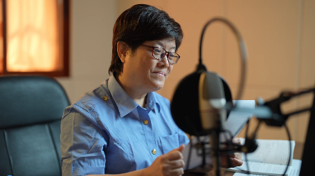 沈建萍在錄制列車廣播信息。