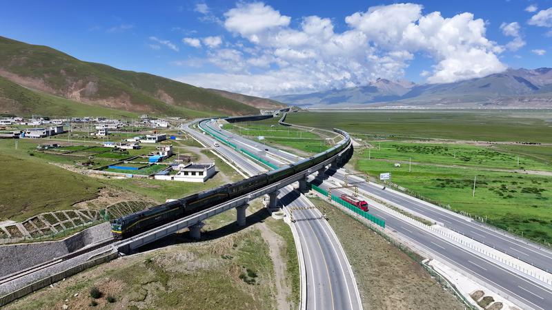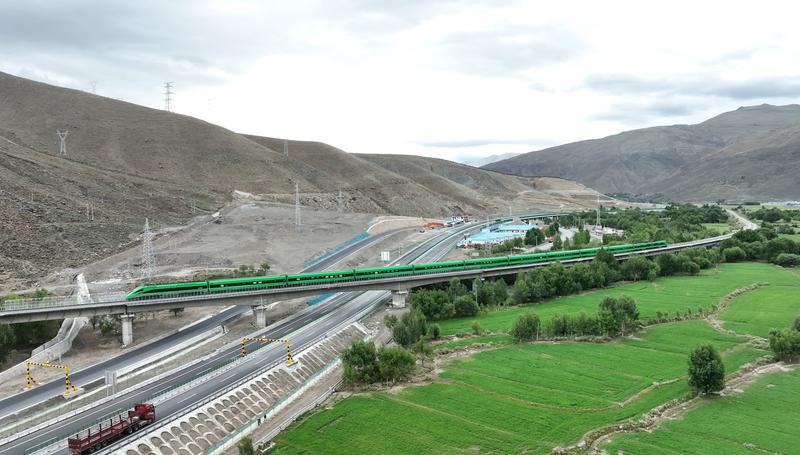 6月30日,G4218雅安至葉城國家高速公路拉薩至日喀則機(jī)場段項目建成通車。圖為318國道 、拉日鐵路 、拉日高等級公路 交錯并行。記者 索朗群培 次旦央吉 扎西頓珠