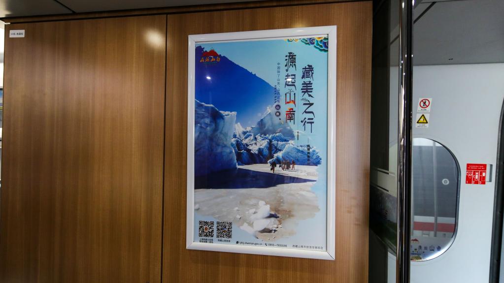 從站臺(tái)開始,醒目的車身外彩貼盡入乘客眼中,由此,山南文化旅游的元素就將伴隨乘客的整段旅程。全列車廂,雍布拉康、昌珠古寺、桑耶古鎮(zhèn)、羊卓雍措等旅游目的地與“藏美之行 源起山南”“世界之巔在西藏 西藏之源在山南”等旅游口號互相輝映,將山南歷史文化與盛景濃縮其中,呈現(xiàn)在旅客面前,讓大家近距離感受山南迷人的美景和悠遠(yuǎn)的歷史。