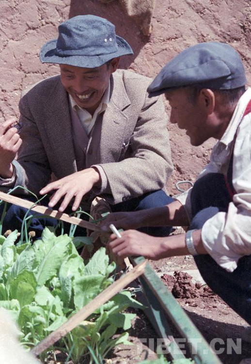 這是時任雙湖辦事處(現(xiàn)雙湖縣)紀(jì)律檢查委員會書記的熊亮兵(左),正在觀察自己在家門口通過搭塑料薄膜小篷試種的蔬菜(唐召明1987年攝)