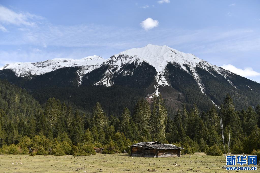 這是5月1日在西藏林芝市工布江達(dá)縣拍攝的新措旁桑通牧場上的木屋。新華社記者 孫瑞博 攝