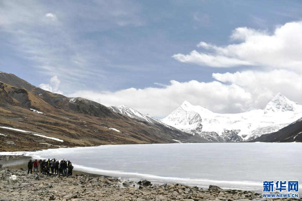 一陣強風掠過薩普雪山腳下的冰湖時卷起湖面的薄冰(5月4日攝)。新華社記者 孫瑞博 攝