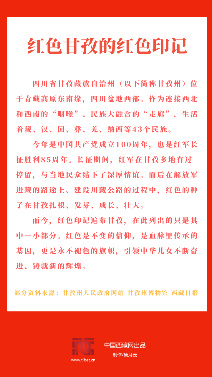 今年是中國共產(chǎn)黨成立100周年,也是紅軍長征勝利85周年。長征期間,紅軍在甘孜多地有過停留,與當(dāng)?shù)孛癖娊Y(jié)下了深厚情誼。而后在解放軍進藏的路途上、建設(shè)川藏公路的過程中,紅色的種子在甘孜扎根、發(fā)芽、成長、壯大。