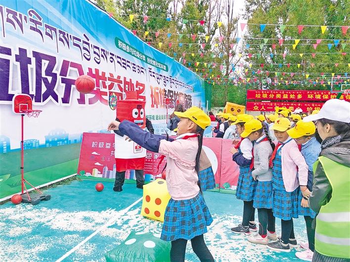 在拉薩市城關(guān)區(qū)組織開展的“不忘初心、牢記使命”主題教育暨“垃圾分類黨員先行 守護凈土人人有責(zé)”活動現(xiàn)場,學(xué)生代表參加趣味游戲。