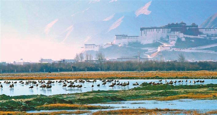 遠處,連綿起伏的山頂還覆蓋著薄薄的積雪,布達拉宮雄偉而秀美;近處,濕地內隨意顯現(xiàn)出的一塊塊水泊,成群的候鳥在水中玩耍嬉戲、在藍天白云下飛舞。見到可愛的飼養(yǎng)員帶來它們喜歡的麥粒,斑頭雁、紅隼、赤麻鴨、黃鴨等紛紛游上岸來,盡情地享受美食,發(fā)出歡快的叫聲。