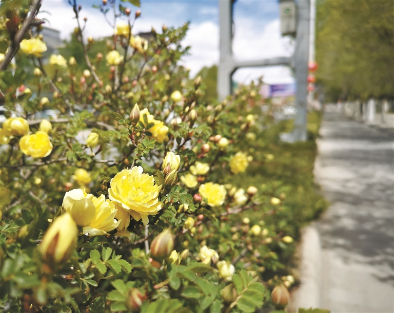 圖為拉薩市市區(qū)街道盛開的黃刺玫。拉薩融媒記者 凃 瓊攝