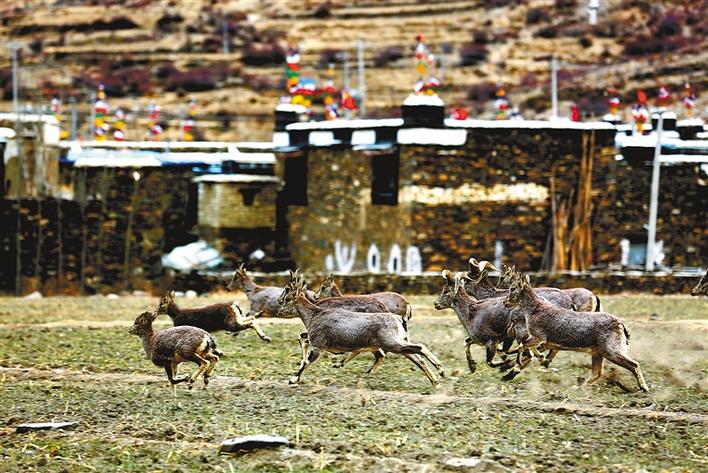 圖為瓊結(jié)瓊果河國家濕地公園瓊結(jié)鎮(zhèn)雪康村段有巖羊出沒。 記者 王菲 通訊員 曲杰 攝