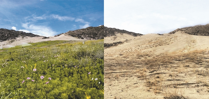 圖為空港新區(qū)防沙治沙與生態(tài)修復(fù)試驗(yàn)項(xiàng)目中同一處坡面生態(tài)修復(fù)前(右)與生態(tài)修復(fù)后(左)的對(duì)比。拉薩融媒記者 凃 瓊攝