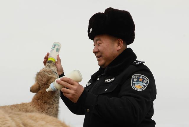 可可西里巡山隊員鄧海平給藏羚羊幼仔喂奶(12月6日攝)。