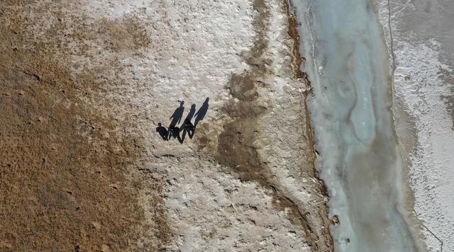 12月7日,站長趙新錄(中)與隊友鄧海平(左)、達(dá)才在可可西里索南達(dá)杰保護(hù)站管護(hù)區(qū)域內(nèi)巡查(無人機照片)。