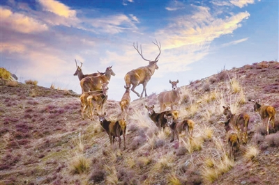 圖為在德令哈市雅撒圖地區(qū)成群結隊的白唇鹿在山上自由奔跑、覓食?!〈饔婪濉z