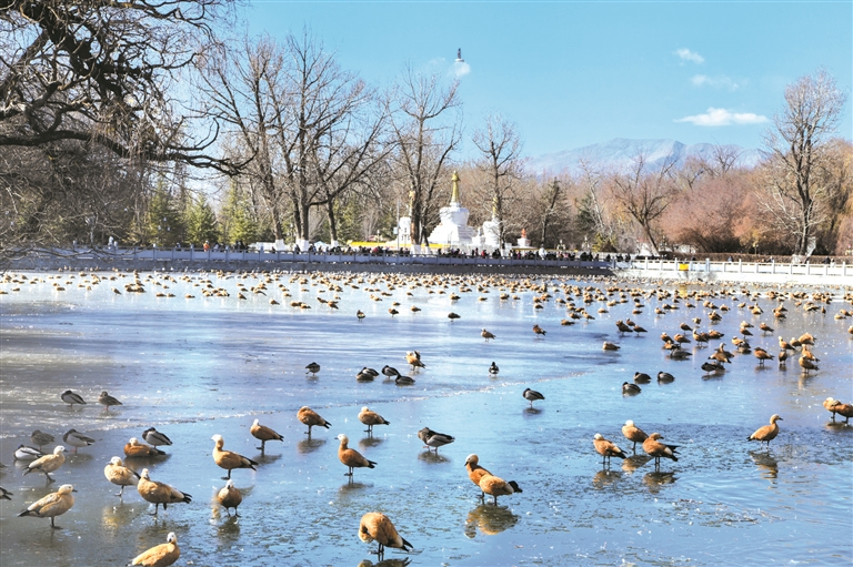 隨著天氣越來越冷,拉薩市宗角祿康公園里的人工湖已結(jié)了一層厚厚的冰,來自各地的候鳥像一群“精靈”,聚集在結(jié)冰的湖面,或嬉戲覓食,或展翅飛翔。