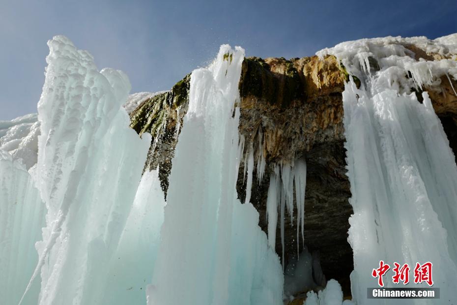 2021年1月23日,祁連山國家公園崗什卡雪峰山腳下的七彩冰瀑,由于溪水中含有多種礦物質(zhì),在冬日暖陽的照耀下,散發(fā)出五彩繽紛的綺麗風光,蔚為壯觀。中新社發(fā) 成 林 攝