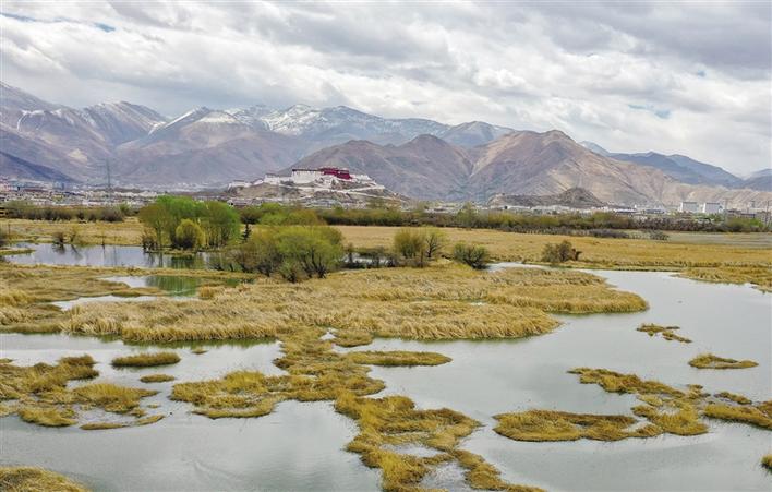 從拉薩市當(dāng)熱西路上向北望去,便能看到這塊北面靠山,東、南、西三面為市區(qū)包圍,面積12.2平方公里的濕地。遠處,連綿起伏的山頂還覆蓋著薄薄的積雪,布達拉宮雄偉而秀美;近處,濕地內(nèi)隨意顯現(xiàn)出的一塊塊水泊,成群的候鳥在水中玩耍嬉戲、在藍天白云下飛舞。拾階過橋,一條木質(zhì)長廊向濕地中延伸,只是我們這些不速之客的到來,驚起水鳥無數(shù)。它們仿佛商量好似的沖上藍天,讓人為打擾它們的棲息而不安。