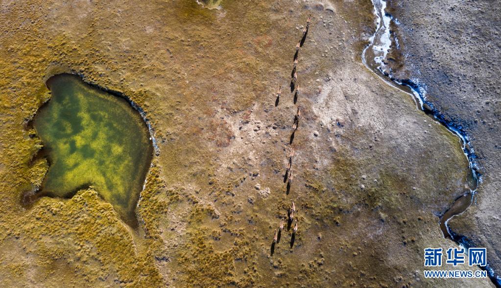 2019年10月19日,藏野驢在三江源地區(qū)活動(無人機(jī)照片)。新華社記者 吳剛 攝