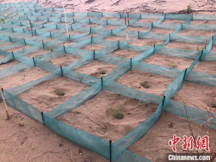 “傳統(tǒng)的方法是用廢樹枝等擺成方格等一定的形狀壓沙,里面再種上植物,效果很好但樹枝往往四五年就腐爛了;最近我們?cè)趪L試推廣一種新型化學(xué)材料方格,成規(guī)??欤夷芫S持七到十年。”中國科學(xué)院西北生態(tài)資源研究院研究員常學(xué)向?qū)τ浾哒f。