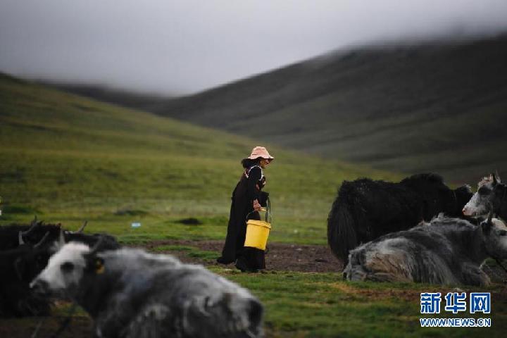 8月3日,在果洛州瑪沁縣當(dāng)洛鄉(xiāng)貢龍村的夏季草場(chǎng)上,牧民準(zhǔn)備擠牛奶。新華社記者 張龍 攝