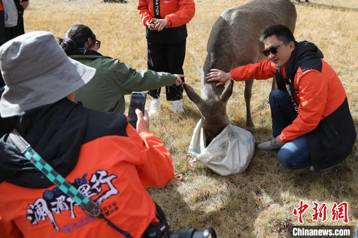 圖為西藏類烏齊馬鹿國(guó)家級(jí)自然保護(hù)區(qū)的管護(hù)員正在飼喂馬鹿?!∪轿木?攝