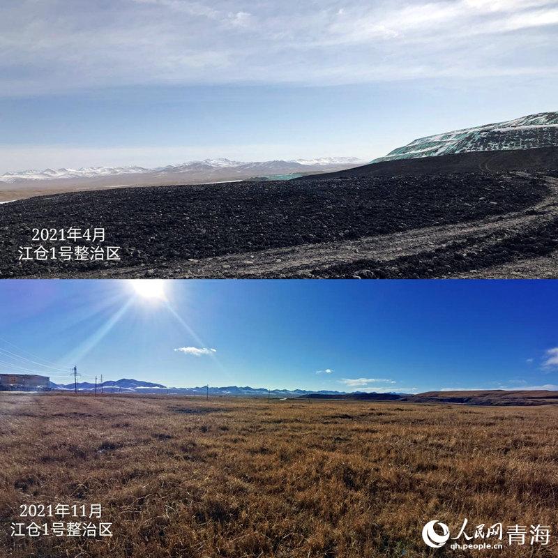 木里礦區(qū)江倉(cāng)1號(hào)礦復(fù)綠前后對(duì)比。人民網(wǎng) 甘海瓊 攝