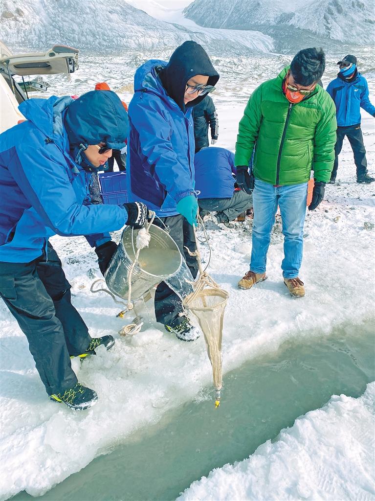 為全面系統(tǒng)摸清水質(zhì)狀況,監(jiān)測組在崗加曲巴冰川末端融水河流斷面開展了水溫、電導(dǎo)率、溶解氧、PH值的現(xiàn)場監(jiān)測,同時開展了微塑料、抗生素等指標的全分析及生態(tài)監(jiān)測的采樣工作。