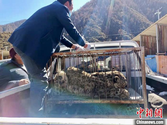 圖為工作人員將雪豹運送至林芝市野生動物收容救護站?!×种ナ辛植菥止﹫D