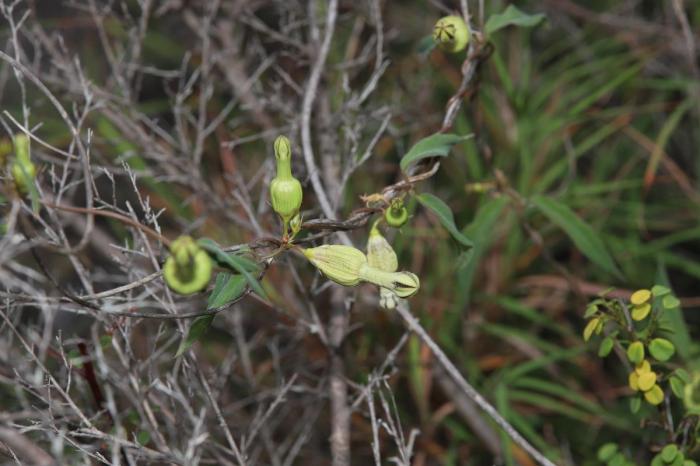 綠汁江吊燈花形態(tài)上與匙冠吊燈花近似,但該種花梗較長且疏被柔毛,花冠筒上部的直徑僅為下部的一半,花冠裂片內(nèi)部密被白色長柔毛,外輪副花冠裂片具2齒,這些特征可與其近似種明顯區(qū)別。目前,科研人員僅在易門縣綠汁鎮(zhèn)后山坡發(fā)現(xiàn)一個(gè)居群,零星的分布在干熱河谷稀樹灌草叢中,生境受人為干擾較為嚴(yán)重,根據(jù)IUCN的評估標(biāo)準(zhǔn)將其瀕危等級評估為極危。