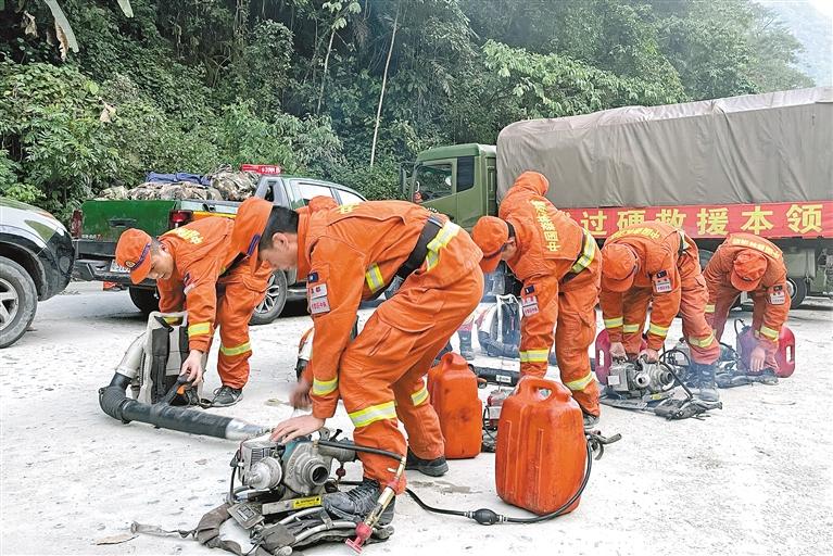 圖為在重特大森林火災(zāi)長(zhǎng)途機(jī)動(dòng)滅火增援實(shí)戰(zhàn)演練過程中,消防救援人員對(duì)裝備進(jìn)行檢查維修。圖片由昌都市森林消防支隊(duì)提供