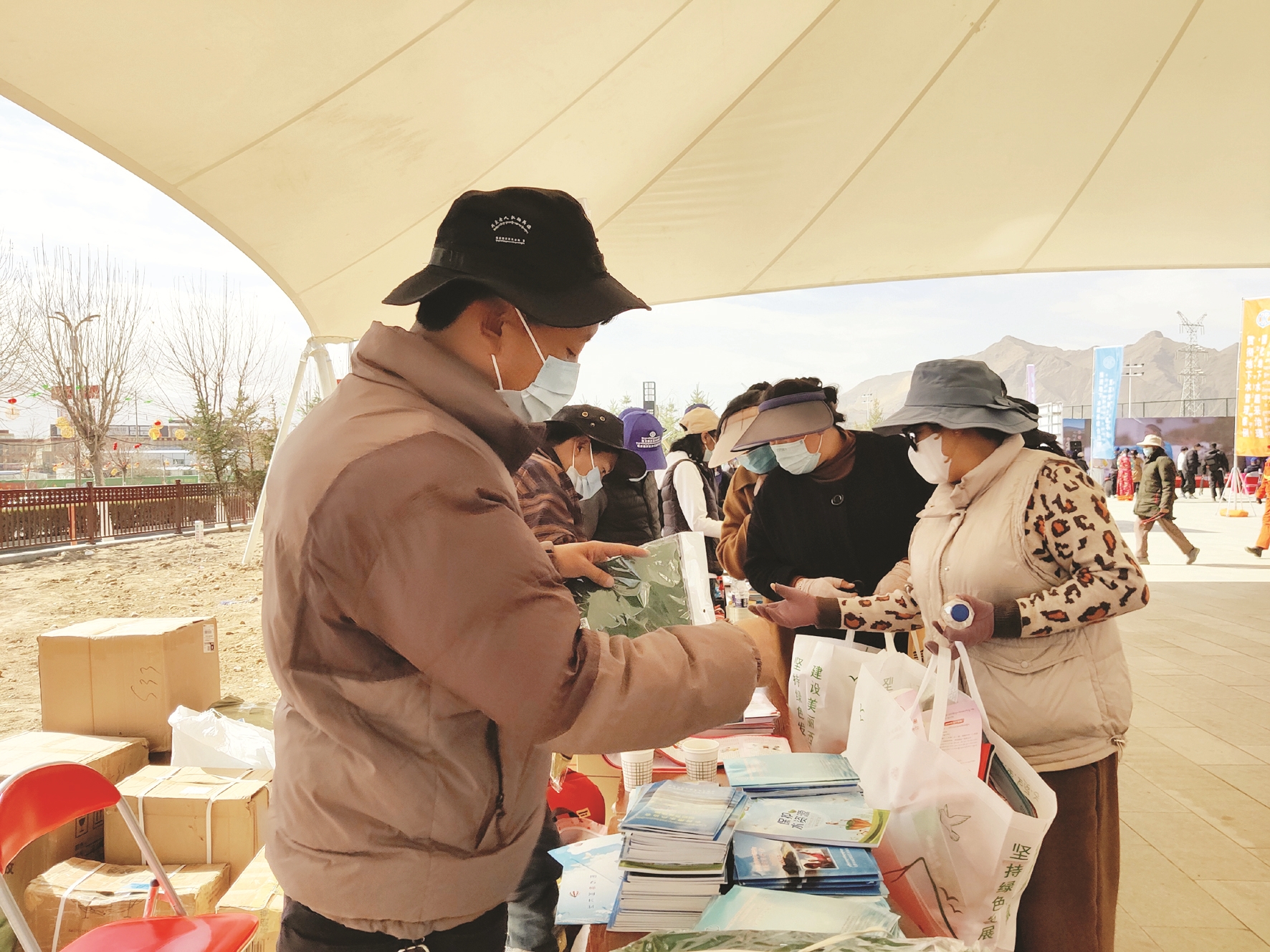 圖為工作人員在為群眾發(fā)放節(jié)水紀(jì)念品和宣傳冊。 拉薩融媒記者 余洋洋攝