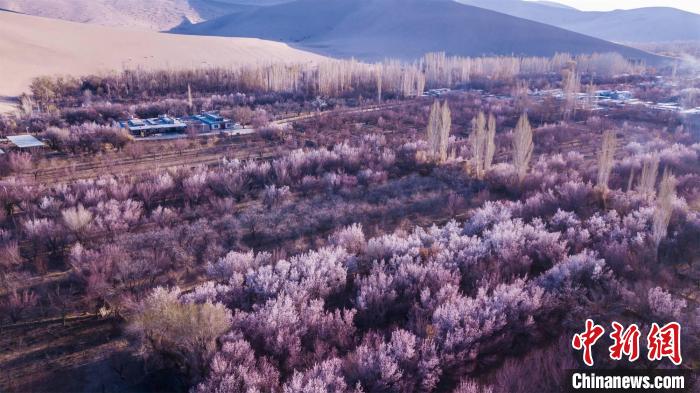 “中國旱極”敦煌位于甘肅西端,此時正進入最美季節(jié)。千畝杏花將月牙泉鳴沙山圍成粉色“杏花?!薄V蒙泶颂?,前面是一片花,后面卻是望不到邊的沙丘,像在游戲場景,而非人世間。