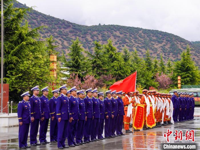 林芝市森林消防支隊(duì)營(yíng)區(qū)人員列隊(duì)歡迎駐防分隊(duì)歸來(lái)。 李國(guó)燾 攝