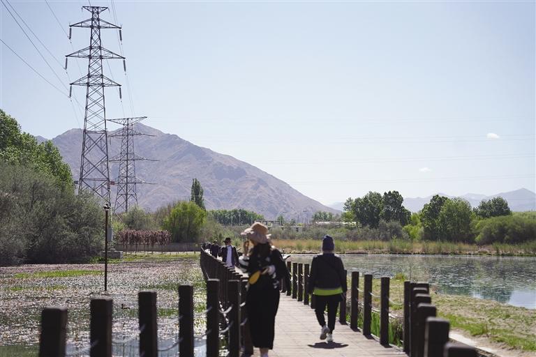 “走進拉魯濕地,生機勃勃的盎然綠意、層次分明的景色讓人心曠神怡。遠處,連綿起伏的山頂還覆蓋著薄薄的積雪,布達拉宮美輪美奐;近處,濕地內(nèi)的一塊塊水泊,成群的候鳥在水中玩耍嬉戲、在藍天白云下飛翔?!庇慰屯醴颊f,“我和家人剛來拉薩,聽朋友說拉魯濕地已經(jīng)開放,就想來打卡,也是第一次來拉魯濕地,這兒的空氣濕度適宜,在拉魯濕地運動,不僅能享受運動帶來的快樂,還能欣賞怡人景色?!?/p>