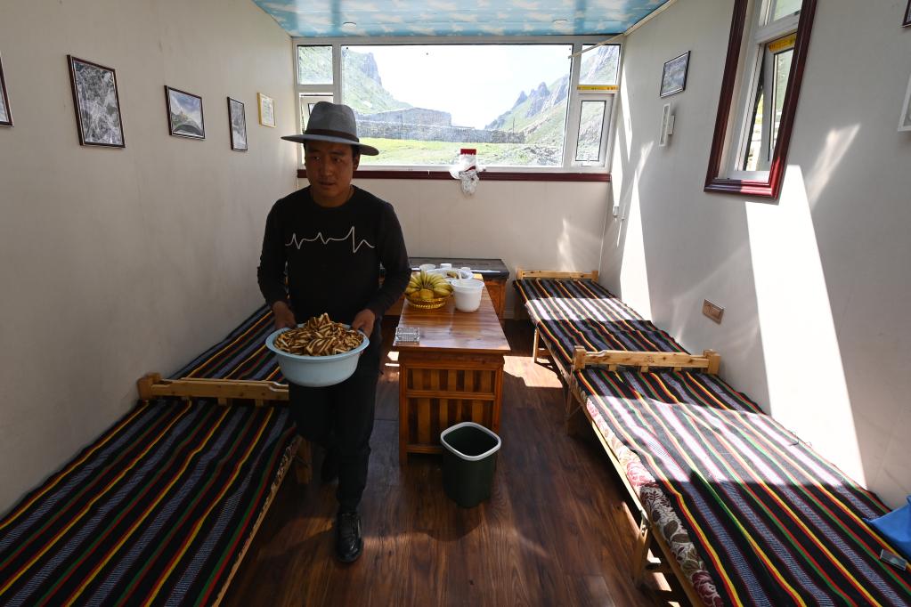 盛夏,昂賽大峽谷流水潺潺、綠草如茵;四周山勢(shì)奇絕,常有雪豹、白唇鹿、巖羊等野生動(dòng)物出沒。在特許經(jīng)營接待集裝箱內(nèi),桑周忙著打掃衛(wèi)生,清洗床鋪,準(zhǔn)備迎接從各地到來的自然體驗(yàn)者。