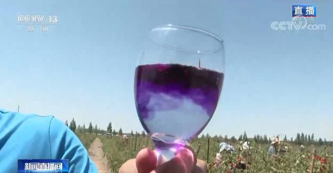 除了紅枸杞之外,這里還種植了15000多畝的有機黑枸杞,黑枸杞的成熟時間要遲一些,在8月下旬,所以我現(xiàn)在手里只有黑枸杞干。大家可以看一看,如果我們把它也像紅枸杞一樣泡入水中的話,顏色展開得非常快,幾秒鐘的時間水就已經(jīng)是藍紫色了。當?shù)氐呢撠?zé)人告訴我,這很大程度是因為它的花青素含量高,所以黑枸杞也有另外一個名字,叫作“花青素之王”。