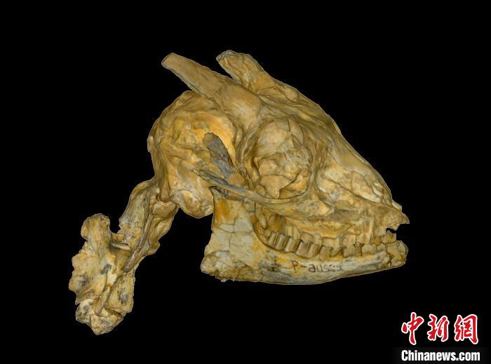 鄧氏臨夏羚的頭骨和頸椎化石標本?!≈锌圃汗偶棺邓?供圖