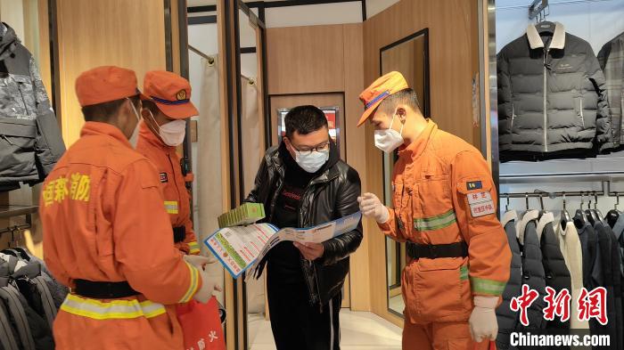 消防隊(duì)員正在向商家講解防火知識?!≡辣蟆z