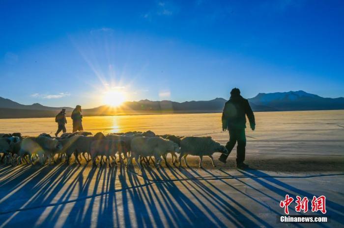 這個邊境小村3日迎來了一年一度的“趕羊”盛事。村民們將1400余只羊由岸邊通過厚實的冰面趕往湖心島牧場。普姆雍措被稱為“仙女之淚”,位于西藏山南市浪卡子縣,每到冬季極寒時,便是羊群轉(zhuǎn)牧場的好時機。