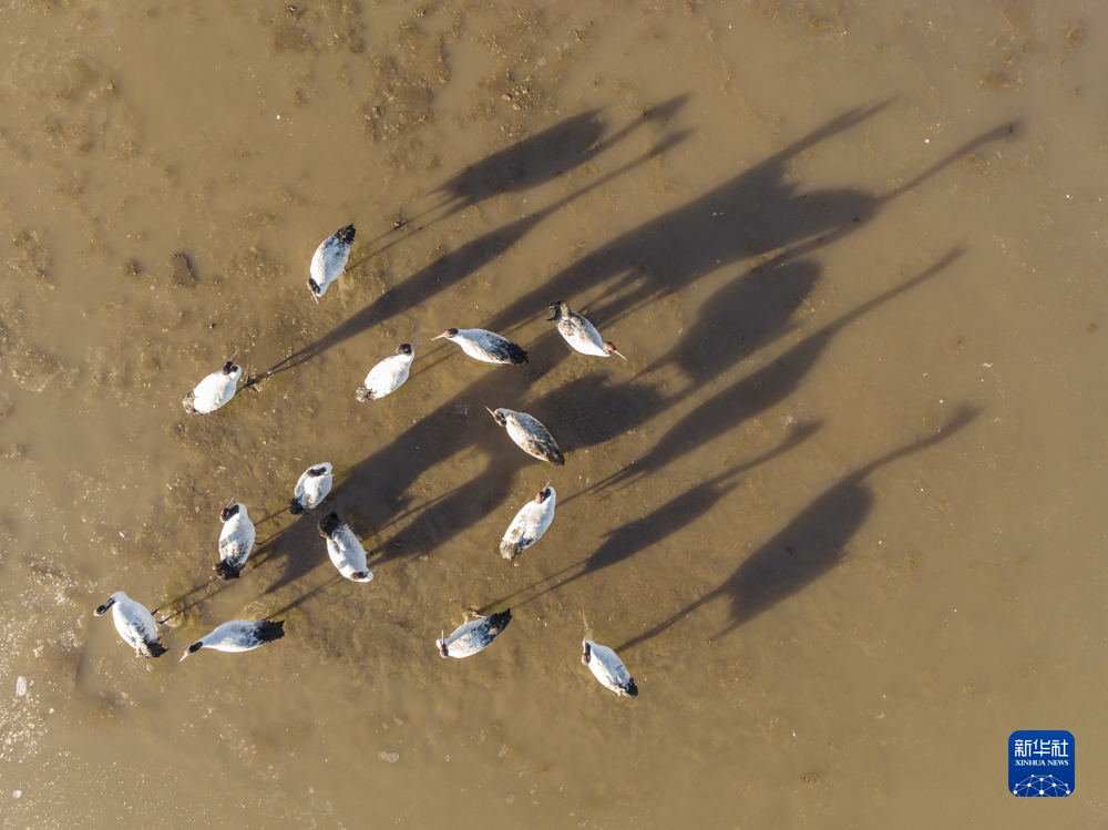 這是在拉薩市林周縣卡孜水庫拍攝的黑頸鶴(3月1日攝,無人機照片)。新華社記者 孫非 攝